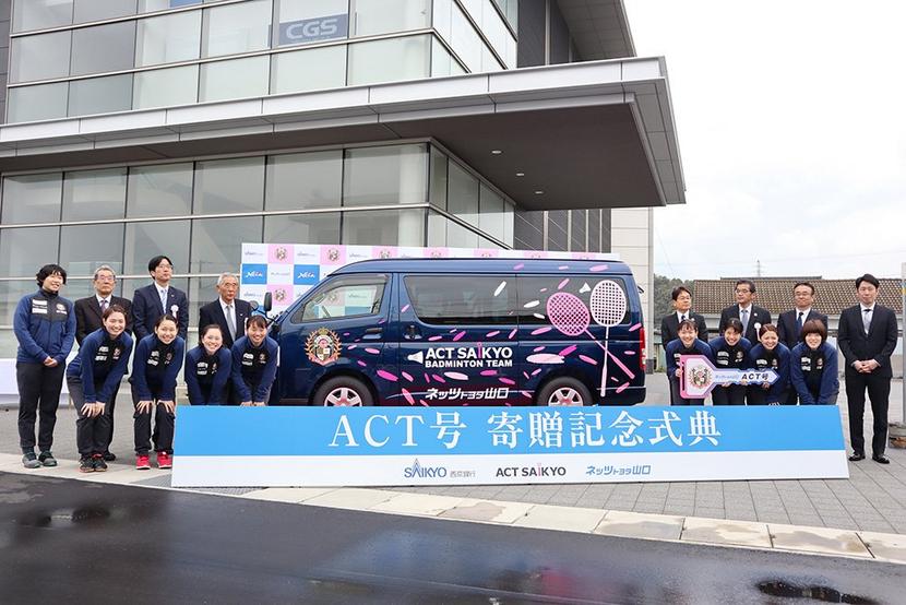 周南市栗屋のネッツトヨタ山口(佐藤紘二社長)は4日、女子実業団バドミントンチームの「ACT SAIKYO」に10人乗りのワンボックスワゴン車「トヨタハイエース...