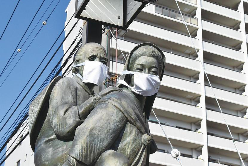 お父さんにうつさないで! 速玉町の孝女阿米像にマスク