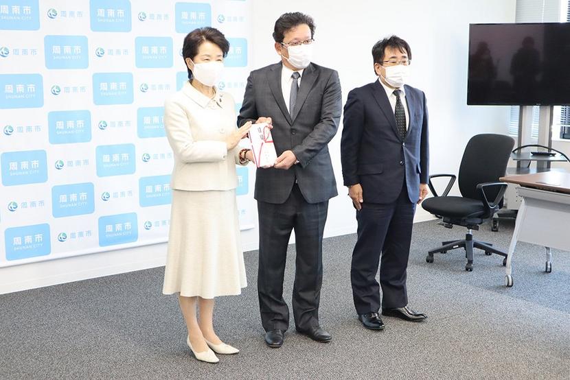 建装は宇部市に本社を置く従業員19人の会社で、主に内装工事を営んでいる。周南営業所は2003年に開設し5人が勤務。周南地域の様々な建設現場で工事実績があり、現在の危機的状況を地域の人々と共に乗り切りたいとの思いから今回の寄付を決めた。同社は今後、宇部市、事業所がある下関市、県へもそれぞれ100万円を新型コロナウイルス対策のために寄付する予定だという。