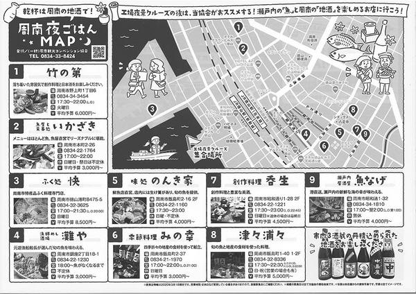 周南市の周南観光コンベンション協会が瀬戸内で採れた魚と周南の地酒を楽しめる飲食店を掲載した「周南夜ごはんMAP」を作成した。工場夜景クルーズの参加者などに配る...