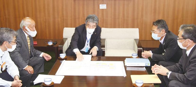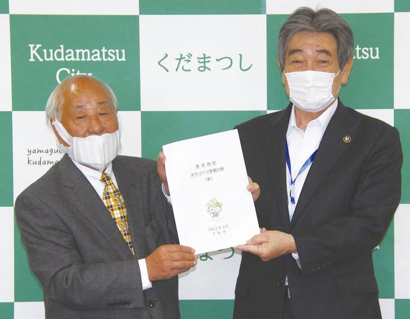 地域周南市下松市豊井地区の土地区画整理事業を見直す「豊井地区まちづくり整備計画」がこのほどまとまり、22日、計画を策定した豊井区画整理見直し協議会の清木健一会長(73)が市役所で国井市長に報告した。市はこの計画に沿い、16年後の2036年の完成を目指して街路整備の手法で整備を進めていく。