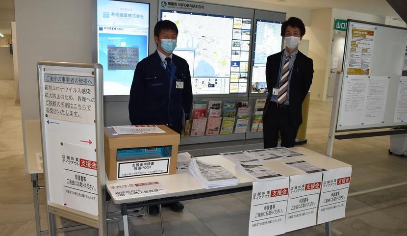 申請書はホームページからプリントできるようにして1日から原則として郵送で受け付けるとともに、市役所1階のロビー、2階の商工振興課前に申請書などと受付箱を置いている。