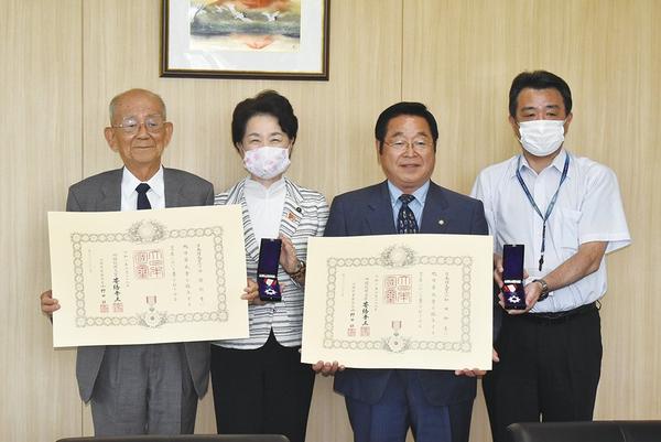 今年春の叙勲でそろって地方自治功労で旭日単光章を受章した周南市新南陽地区の寿町自治会長の中村利孝さん(84)と新開作自治会長の和田和年さん(74)が17日、市...