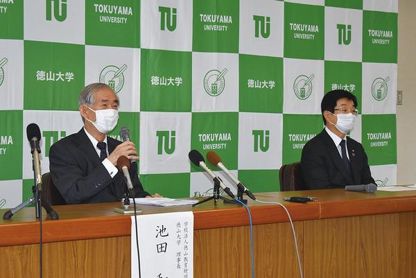 周南市の徳山大学の高田隆学長と同大学を経営している徳山教育財団の池田和夫理事長は4日、同大学で記者会見して改革の取り組みなどをまとめた報告書「徳山大学の現状と...