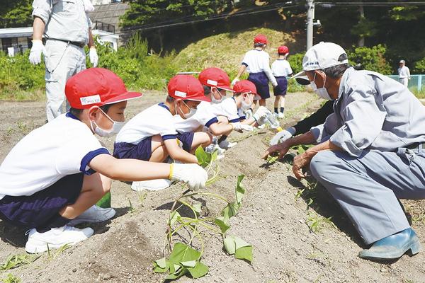 秋の収穫を願って 1、2年生102人が苗植え体験 櫛浜小でサツマイモ200本