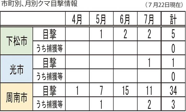 周南市でツキノワグマと思われる動物の出没情報が多くなっている。県などによると26日までの同市の出没情報は痕跡、捕獲を合わせて7月だけで14件。19日から26日...