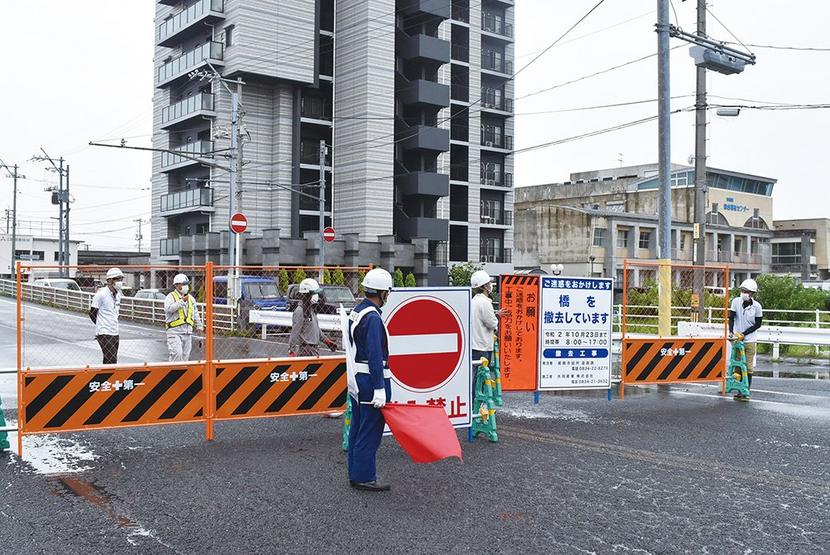 周南市の古川跨線橋の架け替え工事のため、6月30日正午から10年間の全面通行止めが始まった。正午になると車が途切れるのを待って橋の撤去を請け負う業者がフェンス...