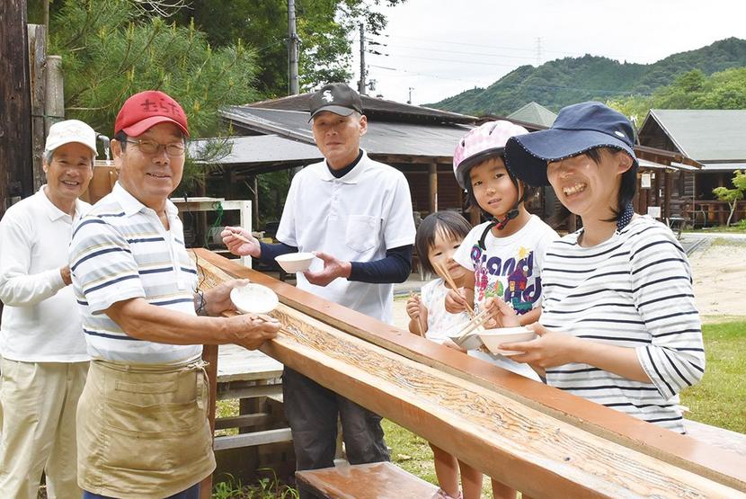 そうめん流しのコーナーと村田さん(左から2人目)ら