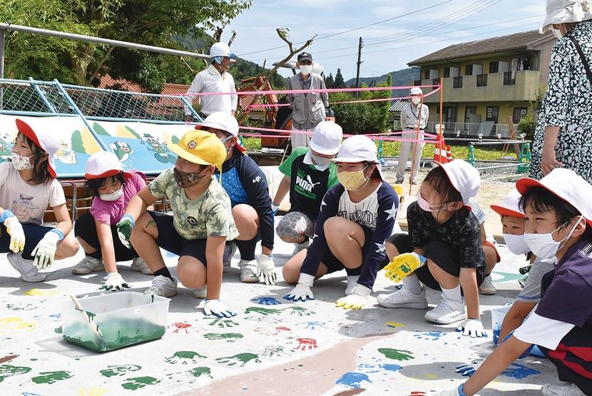 周南市の湯野小(藤室恒一校長、38人)の全校生が20日、同校の前の市道にかかる原橋の架け替え工事に合わせ、新しい橋の床のコンクリートに手形で木の絵を描いた。絵...
