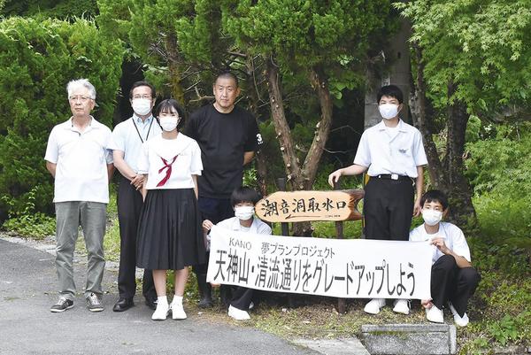 潮音洞取水口の案内看板 夢プランで清流通りに 中学生も手伝って