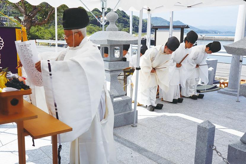 この日は、同会の会員12人、大津島の氏神の山崎八幡宮の河谷昭彦宮司(84)、児玉倩史権禰宜(74)、回天顕彰会の原田茂会長(82)が出席。参列者は国歌と鎮魂歌の「海ゆかば」を斉唱し、斎主の河谷宮司が慰霊と不戦の誓いを述べた祝詞を奏上した。