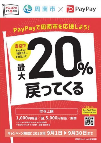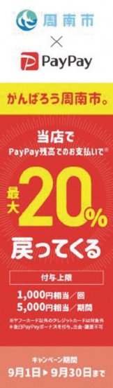 周南市の「がんばろう周南市。キャッシュレスで最大20%戻ってくるキャンペーン!」が9月1日(火)から始まる。キャッシュレスのPayPayで決済すると1回千円、...