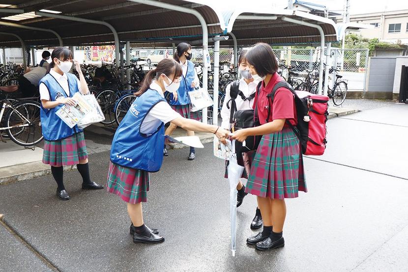 自転車の鍵かけを呼びかける生徒
