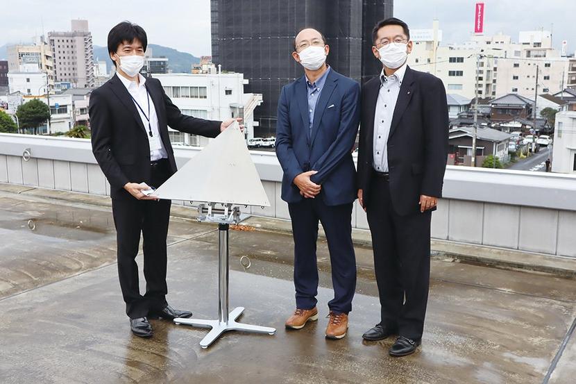 17日に周南市役所の屋上でマーカー設置第一号のデモンストレーションが開かれ、松田社長と同大大学院創成科学研究科の長井正彦教授、中電技術コンサルタントの荒木義則先進技術センター長が事業概要を説明した。