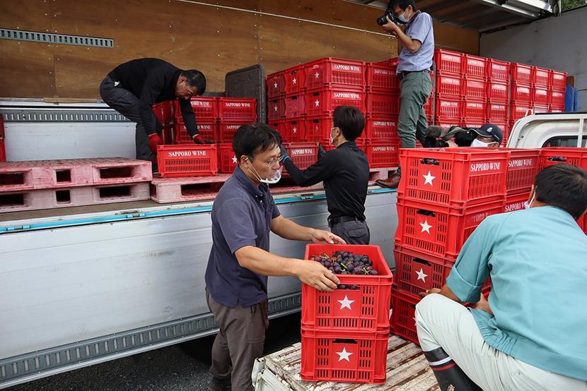 周南市金峰のふれあいプラザ須金の駐車場で25日、周南市須金地区のブドウでつくるワイン「徳山巨峰SUGA―NE(シュガーネ)2020」の原料用のブドウの巨峰が出...