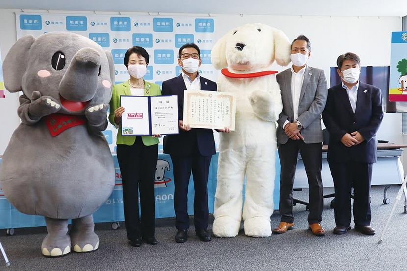 左からシュウゾウ、藤井市長,平尾社長、ハッピーワオン、高部長、中島部長