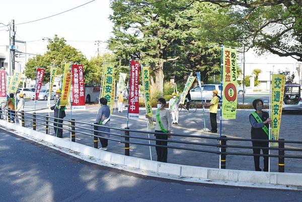 秋の全国交通安全運動の一環で23日朝、周南市役所前の交差点で、市内の老人クラブから集まった25人がこの日に合わせて用意した「交通安全」ののぼりを手に立哨してド...