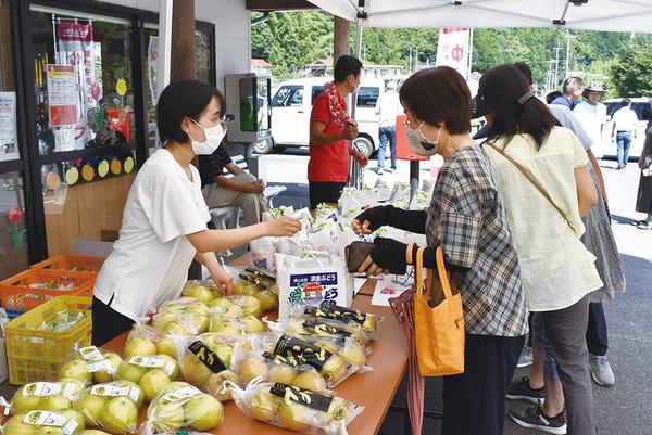 周南市須金地区の須金なし・ぶどう祭が8月29日、新型コロナウイルス感染拡大防止のためドライブスルー形式の抽選会などを取り入れて会場を分散して開かれて大にぎわい...