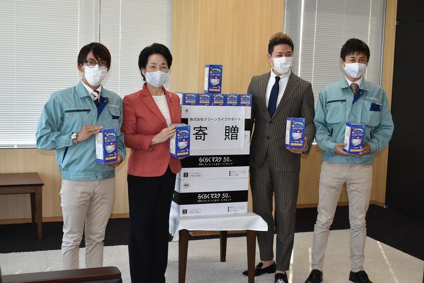 この日は山口エリア統括の長広恭平さん(36)、藤井貴宏さん(36)と平田善則取締役が訪れ、藤井市長にマスクを手渡した。市長は「立派なマスクをありがとうございます。大切に使います」と感謝していた。どこで使用するのかなどはこれから検討する。