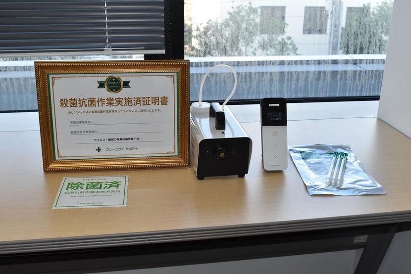 飲食店やエステサロン、病院や事務所などで使われている。「殺菌抗菌作業実施済証明書」やステッカーも発行している。マスクの寄贈はこの街で生まれ育った長広さんらが新しい仕事を始めるにあたって「恩返しのためになにかしたい」と思い立って実現させた。同社の電話は080-5618-0567。