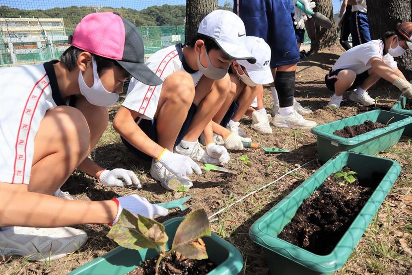 この日は、爽やかな秋晴れで、体操服の生徒は根を切らないようプランターの土を手で深く掘って苗をとりだした。校庭の周囲のフェンスぎわの土をスコップで15センチほど掘り穴を作って移しかえ、プランターの土をかぶせてジョロウで水やりをした。アジサイは来年の初夏に花を咲かせ、その後も毎年花を咲かせる。肥料が要らず手入れも難しくないという。