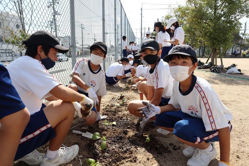 2年の徳永智月君(14)は「土が固くて大変だったが、きれいな花が咲くことを期待している」、山縣佑理さん(13)は「卒業したあとも学校の前を通って花を見るのを想像すると、とても楽しみ」と話した。