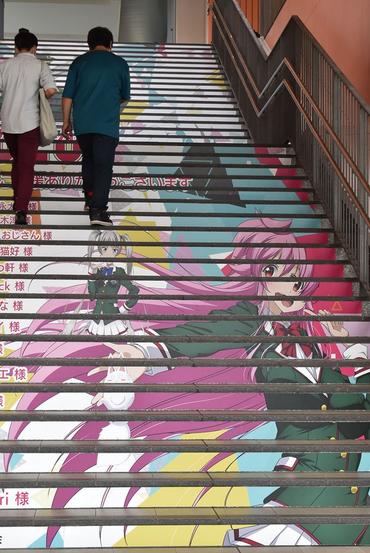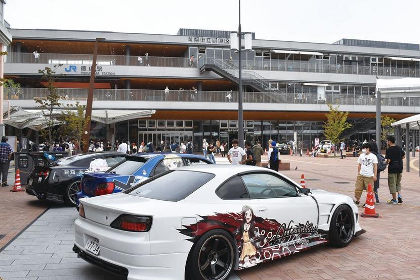 徳山駅北口の広場やみなみ銀座には車体にイラストを描いた「痛車」がずらり。自由通路の階段もステップアートが飾られ、商店街にはクラウドファンディングの協力者の名前が入ったのぼりも並んだ。同図書館の交流室でプラモデルの展示会もあった。
