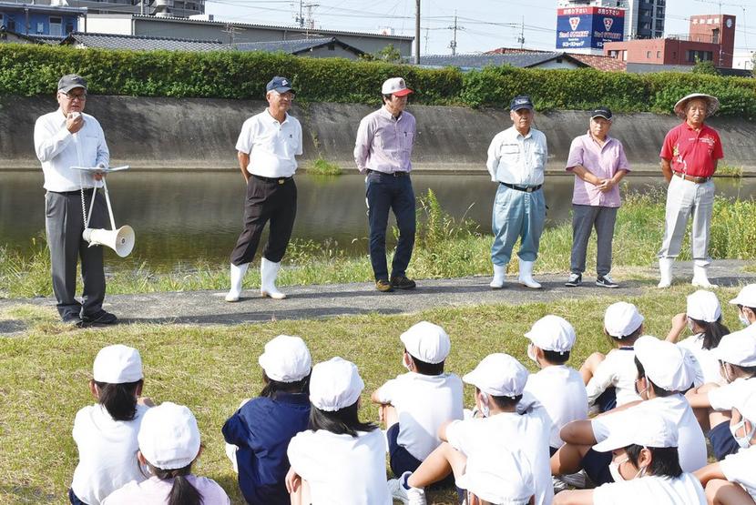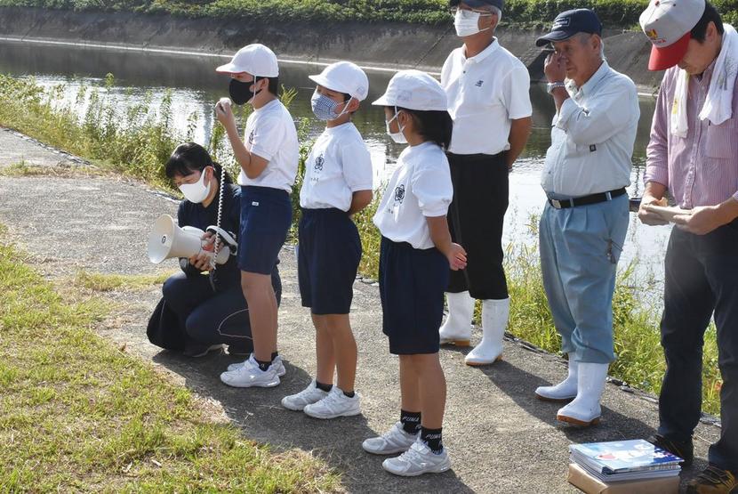 この放流はニシキゴイの愛好者でつくる大日本愛鱗会県支部の協力で実現。近くの河原で開かれた開会のセレモニーでは大野会長(68)のあいさつに続いて、児童の代表3人が「自分が放流したコイを見るのが楽しみです」「とても楽しみにしていました」とあいさつ。