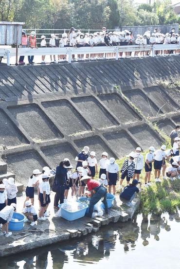 富田川にニシキゴイ 富田東小の児童が放流