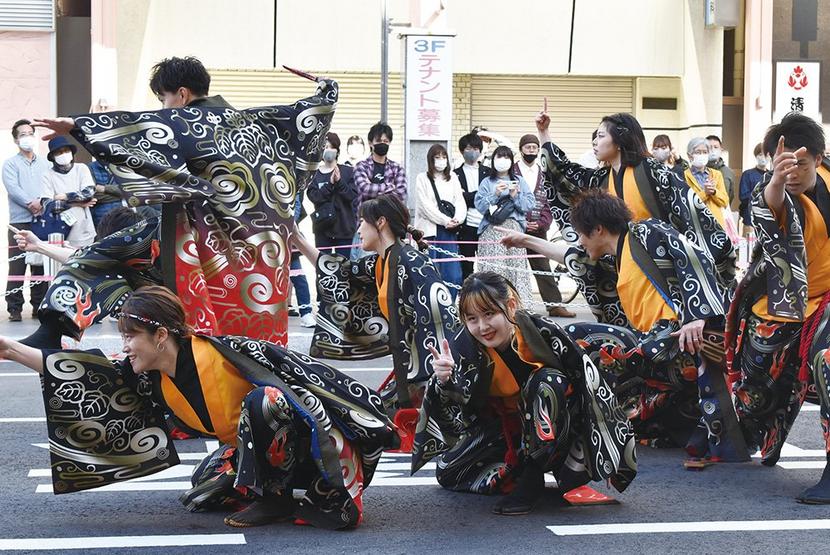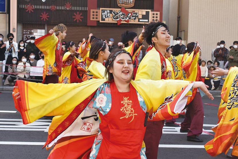 周南市内外から約20チームが参加して、YOSAKOI(よさこい)ぶち楽市民祭(新周南新聞社など後援)が8日、徳山駅前商店街で開かれた。各チームは華やかな衣装で...