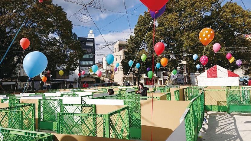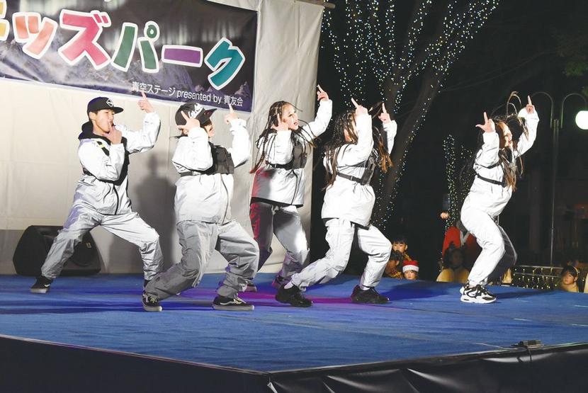 午後1時から公園内に青年部の会員が手づくりした迷路が登場して、子どもたちは迷いながらもゴールまで走って回って楽しそう。夕方からは幼稚園、保育園児やキッズダンスチームの発表があった。