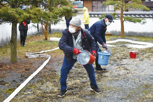 周南市湯野の県指定文化財の山田家本屋で26日、文化財防火デーにちなんだ消火訓練があり、雨の中、山田家本屋保存会(河野貞男会長)などの30人がバケツリレーや敷地...