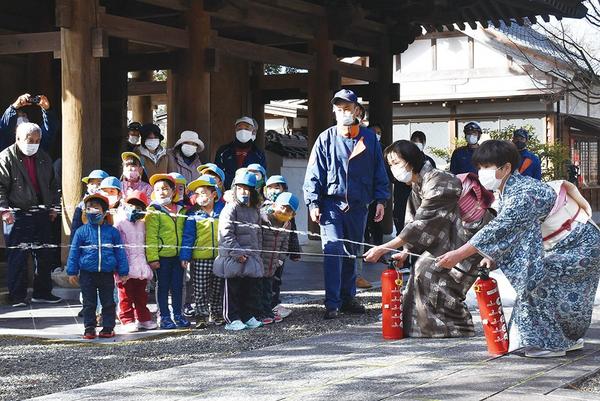 周南市鹿野の漢陽寺(杉村宗一住職)で25日、文化財防火デーに伴う消防訓練があり、同寺の総代、茶道のけいこに通っている人たち、鹿野こども園の園児など50人が参加...