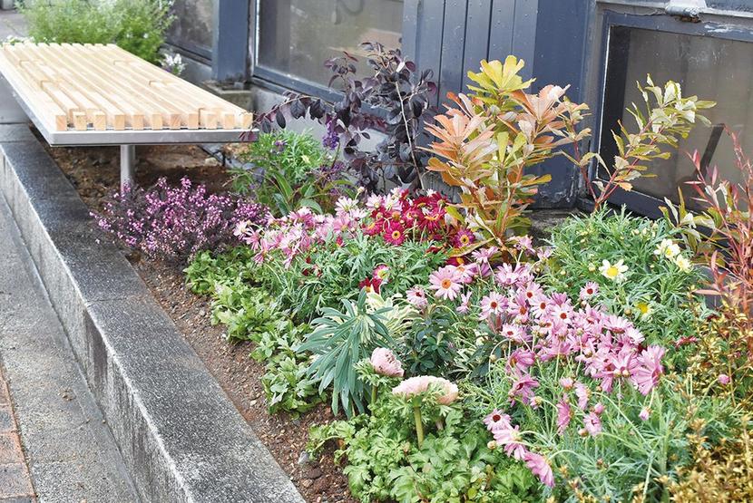 ベンチ6基のうち5基の周囲のグリーンベルトなどに植栽。雑草を取り払って耕し、掘った穴にブルーベリーやエリゲロン、アネモネ、ワイヤープラント、マーガレットなどを次々に植えていった。すでに花を咲かせている苗もあり、歩く人たちを楽しませていた。