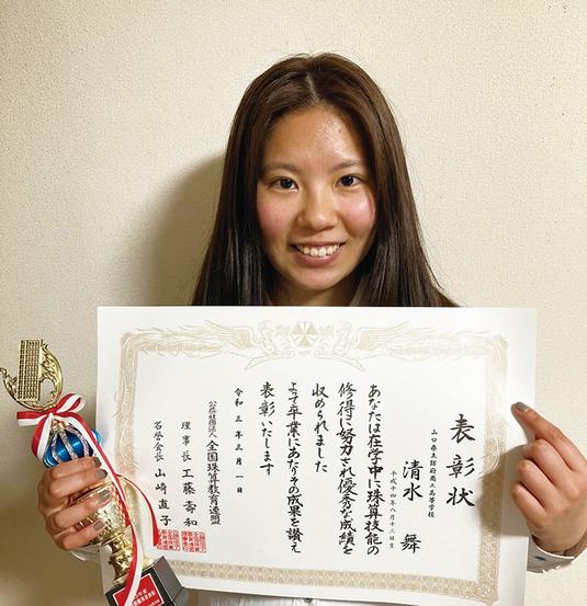 地域周南市周南市遠石で40年以上、珠算塾を開いている佐々木小夜子さん(77)の教え子で、今春に防府商工高を卒業した清水舞さん(4段)が全国珠算教育連盟から珠算技能優秀者の表彰を受けた。同塾からの受賞は3年連続になる。
