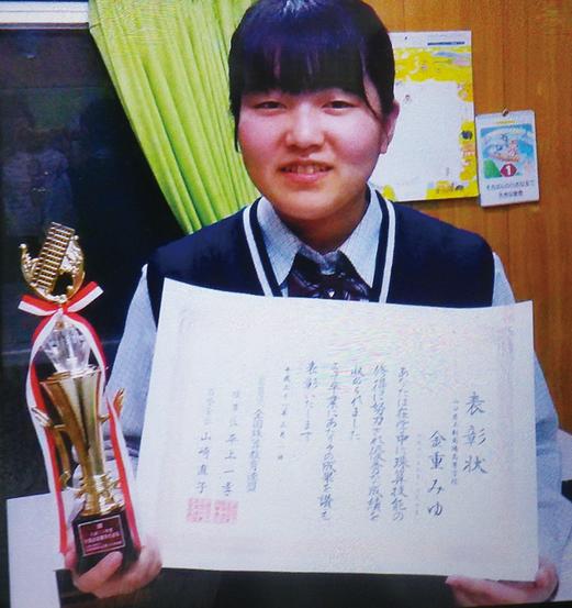 この表彰は、継続して珠算に取り組み段位を取得した高校3年生と高専5年生が対象。同連盟山口県支部が毎年3月、対象者が通う学校に表彰状とトロフィーを送り、学校から卒業式の日に本人に授与されている。