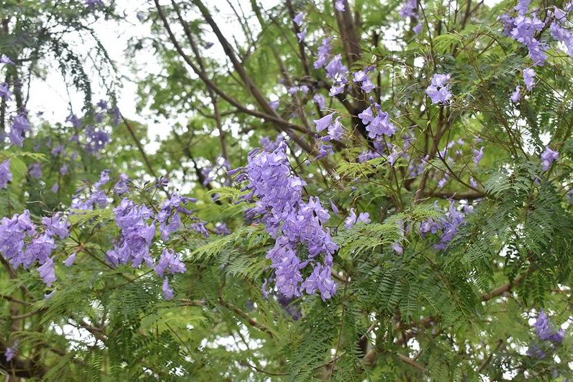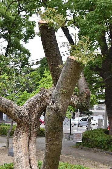 周南市の市役所近くの児玉公園にあるジャカランダの木が今年4月、枝が枯れたため、生きている幹の近くまで枝を切る「強せん定」の処置をした。このため、6月に咲く花を...