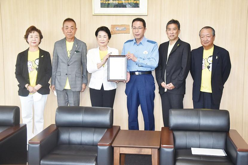 メッセージを伝達した堀江会長(左から2人目)と藤井市長ら(同3人目)ら