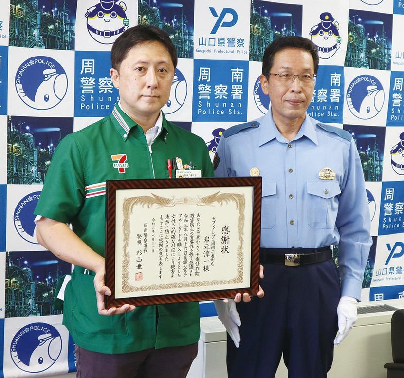 周南署は8月30日、うそ電話詐欺を未然に防いだ功労で、周南市二番町のセブンイレブン周南二番町店のオーナー、岩元淳一さん(40)に杉山兼一署長の感謝状を贈った。...