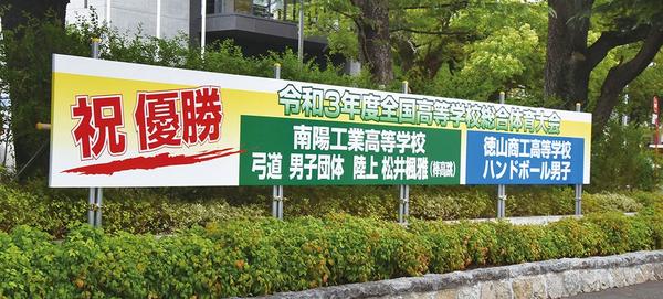周南市は8日、庁舎南側の県道沿いの植え込みに、全国高校総体ハンドボール男子で優勝した徳山商工高、弓道男子団体の南陽工、陸上競技の棒高跳びの松井楓雅選手を賛える...