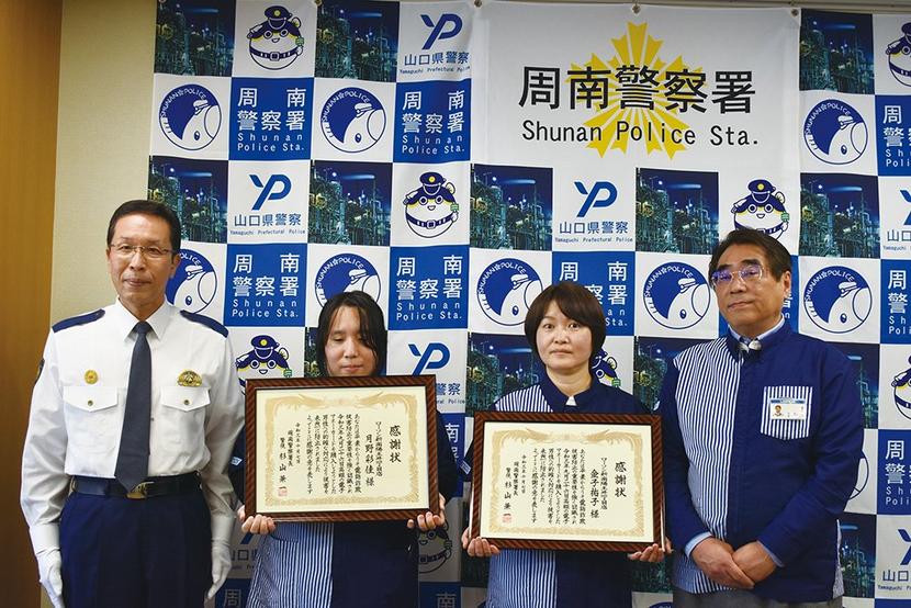 周南警察署は7日、うそ電話詐欺の被害を防いだ周南市のローソン新南陽土井1丁目店(吉松敏裕オーナー)のアルバイト従業員、月野彩佳(さやか)さん(26)と金子祐子...