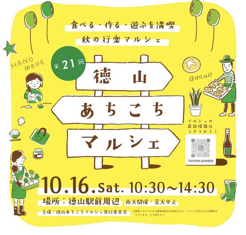 周南市の徳山駅周辺で開催されている、徳山あちこちマルシェが16日(土)午前10時半から午後2時半まで開かれる。21回目となる今回は県内で人気の飲食店やハンドメ...
