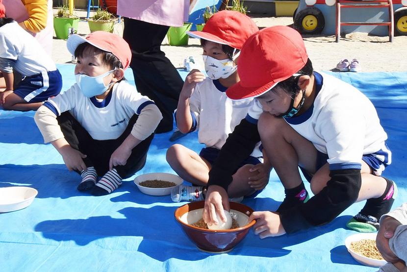 かまで稲刈りをする園児