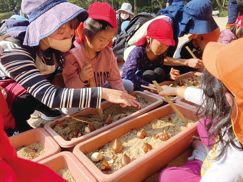 地域周南市周南市富田のTOSOH PARK永源山の「チューリップ満開作戦」が10月25日から始まり、4日間に分けて、新南陽地域の8つの幼稚園、保育園から園児354人がチューリップの球根を合わせて2,900個あまり植えた。