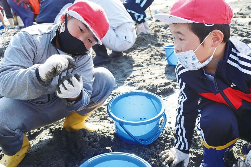 鼓南小6年の柳瞬介さん(11)は「シャベルを入れてギギギッと音がするとアサリがいる」と慣れた様子▽鹿野小4年の宮本信胤さん(9)は「潮干狩りは初めて。テッポウエビなど生き物がたくさんいた。アサリは焼いてポン酢で食べたい」と話した。