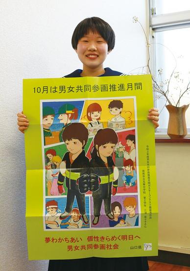 地域周南市周南市の太華中(福田光正校長、366人)の2年の三浦菜々子さん(13)が、男女共同参画推進月間ポスター募集で最優秀賞に選ばれ、10月の推進月間に県内の学校、図書館などに掲示されたポスター750枚とチラシ1万5,000枚に使用された。