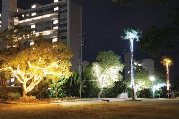 山口県周南市の周陽市民センター北側の緑道公園で、ヤシとクスノキに設置されたイルミネーションが地域の人の目を楽しませている。1月9日(日)まで。 周陽地区社会...