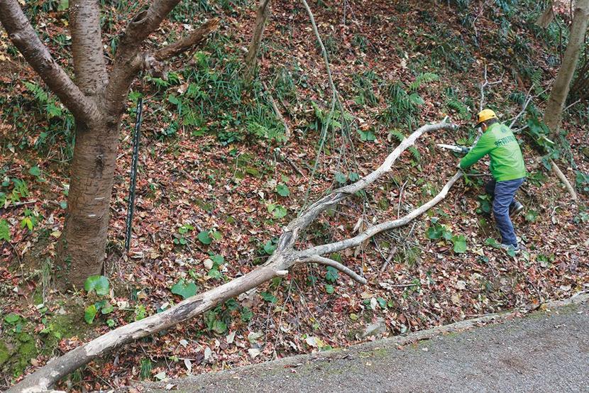 長い枝を切り分ける=山口県周南市福川の若山城跡にて