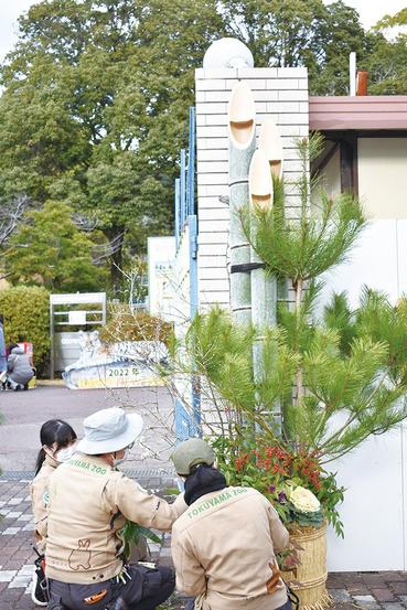 門松を作る職員たち=徳山動物園(山口県周南市)