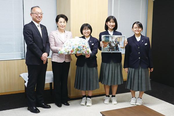 山口県周南市の岐陽中(田中輝久校長、678人)は13日、校内で集めたペットボトルキャップ300キロ、12万個を同市に託し、この日、市役所で寄贈式が開かれた。こ...